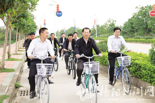 陈绿平骑上自行车,在普侨区体验“绿色出行”活动,实地检查有关工作。本报记者 杨继斌 摄