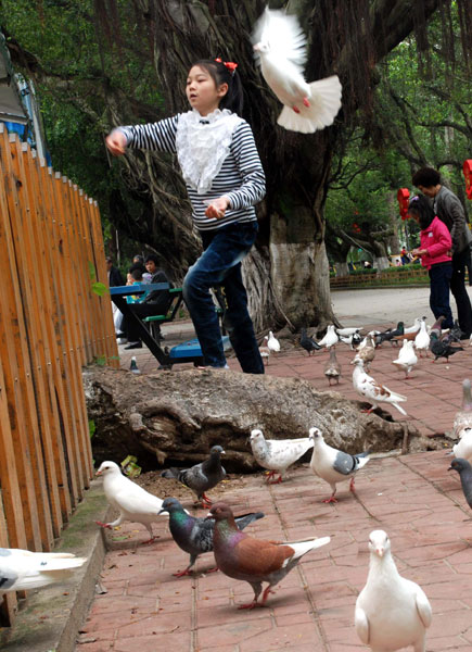 本报讯(记者林子海 林鹏 摄影报道) 近段时间,感染H7N9禽流感病毒事件一直是老百姓十分关注的焦点。记者近日在中山公园看到,园内和平鸽呈常态放养,也仍有市民带着小孩近前喂鸽。但有关人士认为,现阶段最好还是少与鸽子等活禽直接接触,喂鸽后要彻底清洗双手。