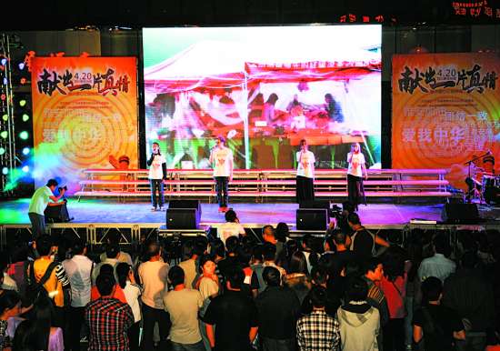 昨晚,由广东省慈善总会汕头存心慈善会主办,汕头市流行音乐协会、铂钠文化传播有限公司承办的“4·20四川雅安地震,献出一片真情”赈灾爱心公益晚会在时代广场举行。表演者们用歌唱、诗朗诵、沙画等方式表达对地震灾区人民的关切之情,为他们祈祷平安,呼吁社会献上爱心。100多名志愿者手抱募捐箱在现场进行募捐,不少市民纷纷解囊相助。市区一家食品公司还提供了几箱食品在现场进行义卖,所得款项全部用于赈灾。近3个小时的义演总共筹得赈灾款88652元。