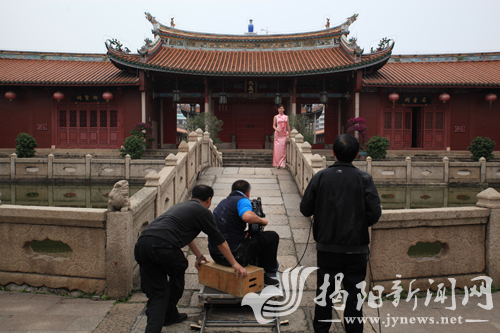 “你是一座学宫,红瓦绿檐,传承着千秋文脉……”一曲家喻户晓、悦耳动听的旋律久久地飘荡在市区揭阳学宫上空,明伦堂内一群穿着汉服的小孩子正聚精会神地听着先生的谆谆教导,身着一袭典雅花裙的陈思思满怀深情缓缓走来,一幅穿越古今的奇妙画面呈现眼前(见图。杨继斌 李文浩 摄)。这是《我的揭阳我的爱》MTV摄制组在揭阳学宫取景拍摄的场面。