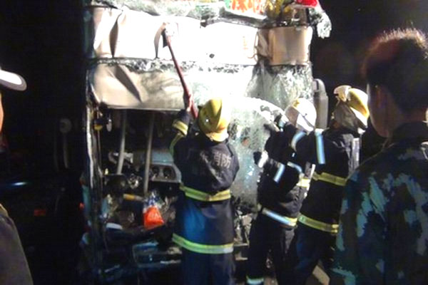 昨晨2时50分,濠江消防中队接报,一辆大客车在深汕高速公路汕头往达濠出口方向撞到路边护栏,导致数人被困,情况紧急。濠江中队迅速出动赶赴现场,看到事发现场一片狼藉,大客车车头严重变形,挡风玻璃碎落一地。消防官兵侦察发现,客车内共有4名群众被困,其中车厢内2人,车头位置2人。