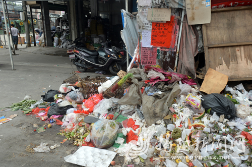 一堆堆垃圾引来了成群苍蝇的“光顾”,塑料袋、果皮、干枯枝叶、饭盒等垃圾沿街堆放成一座座小山,污水横流(见下图。涂英鹏 摄)。在附近章阿姨的服装店里,还不时地闻到阵阵臭味,“已经连续三四天这样了,这里来往的人很多,垃圾这样堆放很不文明,希望有关部门能尽早来处理,还我们一个干净整洁的生活环境。”