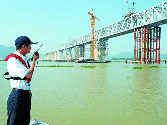 厦深铁路榕江特大桥横跨榕江两岸,有两个主通航孔,每个主通航孔跨度达220米,有“亚洲第一跨”之称,是厦深铁路节点工程。因施工需要,从前年8月起,榕江特大桥主通航孔增设临时支墩,预留的通航宽度由原来的150米缩小为90米,变双向通航为单向通航,严重限制了通航能力。为保障施工期间水上交通安全,汕头海事部门组织开展了持续20个月的24小时全天候水上交通现场管控。据介绍,实施水上交通管控工作20个月来,共有2.7万艘次船舶安全通过该施工水域,实现了“零险情、零事故、零投诉”的目标。