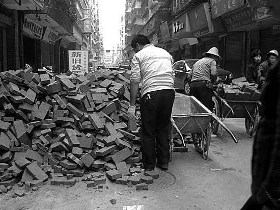 近日记者来到陈厝合宁和街,这条街道是陈厝合片区最宽敞的街道,宽约七八米,平时人来人往非常热闹。但现在马路上不时可看到成堆成堆的建筑用砂石、水泥、砖头和成捆成捆的钢筋,将街道占去一半左右的地方,汽车、摩托车和行人只能在旁通过。有两处工地,工人们甚至就直接在街上施工,进行装卸砂石和搅拌混凝土的作业。