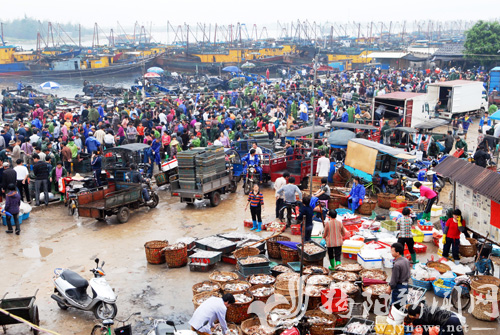 在一个雨天的早晨,记者一行早早来到神泉港采访,想一睹“午夜鱼市”的风采。但比记者更早的,是市场外围停放着准备运载海鲜到各地销售的机动车辆,粗略一数,竟有本地、外地车共200多辆。当我们来到市场中心,只见3000多平方米的旷埕上,人头攒动,货物堆积如山,买卖声此起彼落,走路要“见缝插针”,眼前各式海鲜应有尽有。而渔船靠港、渔民挑运、买家讲价、卖家过秤……贸易的环节丝丝入扣,交织进行,使得整个赶集的场面沸腾起来,却又忙而不乱,蔚为壮观(见上图。郑楚藩 摄)。