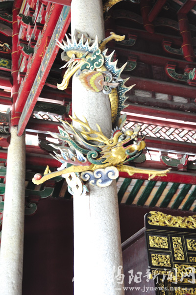 进入学宫,最先映入眼帘的是正面照壁上镶嵌瓷雕的“鲤跃禹门图”,后面有被揭阳人位列五贤之一的明代兵备道楚人杨芷所书的“太和正气”。据史料记载,传说此四字是比喻孔子思想如太空天体循环往复,永恒长存。入“棂星门”,从“泮池”上的拱桥横跨而过,拾级而上,过了“大成门”,穿过柏桧参天、恢宏静穆的天井,便是孔庙的主建筑——“大成殿”了,它以其雄伟端庄,飞桷凌空的夺人气势巍然屹立于孔庙中心。殿内金柱上的木雕五爪浮龙,盘旋飞舞,栩栩如生,那蒸蒸日上的矫健生命力的象征意义昭然若揭。揭阳学宫不仅是祭孔的场所,也是一座儒家文化历史的博物馆。大殿前天井两侧的东西庑上,“大哉孔子展览馆”、“仁之本孝德展览馆”还在演绎着古老的不朽文化。展厅里,面对着大门的孔子恭身而立,双手前伸上举,作“天揖之势”,生动地再现了作为万世师表的孔夫子彬彬有礼,尊师重教而平易近人的圣洁风姿。