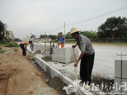 揭东中心片区上围路东段主路面工程已完工,施工人员正加紧安砌道牙石(摄于5月13日)。邢晓荣 摄