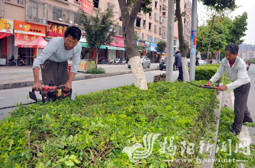 为给市民群众提供一个人与自然、人与人和谐共处的绿色生态活动空间,进一步巩固“创园”成果,市区园林绿化部门切实做好园林绿化管理工作。图为园林工人正在修剪绿化带。本报记者 涂英鹏 摄
