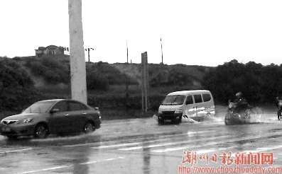 普降暴雨,市区部分低洼路段也因持续降雨而积水。图为在南堤路拐入