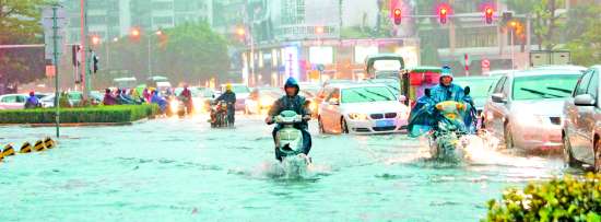 本报讯 (记者孙欣欣)落雨大,水浸街。昨日下午4时左右,一场大暴雨伴随着雷电大风铺天盖地席卷而来,厚重的乌云把城从白天变成了黑夜。两个小时后,黄河路、金砂路、长平路、大学路等市区多个路段都变成了“小河”,部分区域积水严重,交通堵塞。