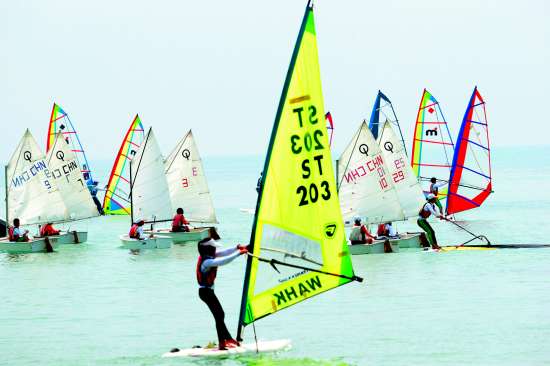 来自各地游客和市民近千人兴致勃勃地在沙滩上观看精彩的沙滩热舞和海上的帆艇表演。