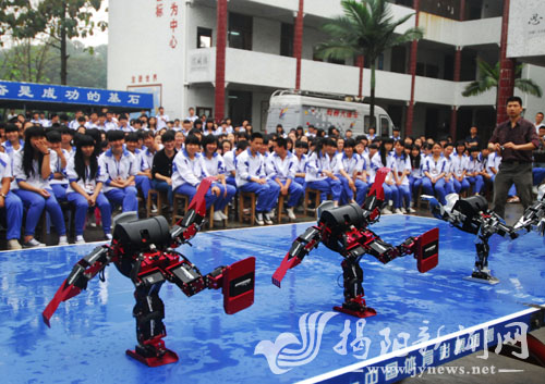 近日由市科协主办的广东(揭阳)科普大篷车进校园系列活动,是我市2013科技进步活动月系列活动的重头戏,通过“科普大篷车”这个载体,把广东科学馆的展品送到揭阳来,让大家在家门口就能亲自动手、亲身体验,真切感受科技的无穷魅力。图为科普大篷车开进空港经济区新华中学当天的机器人表演场面。卢泽鸿 摄