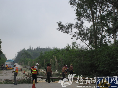 惠来公路部门组织路政人员锯低公路两旁的大树