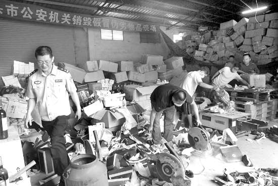 昨天上午11时,市公安局经侦支队将打假行动中缴获的、暂存放在泰山路“嘉诚”仓库的537瓶假“拉菲”红酒和48922双假“匡威”运动鞋等物品清理出来,进行集中销毁。随着铁锤敲打,一瓶瓶假“拉菲”红酒被砸碎销毁,而假“匡威”运动鞋也被用切割机切割销毁。据经侦支队有关负责人介绍,该支队在获悉有人利用网络交易平台销售假冒的假“匡威”运动鞋的线索后开展侦查工作,发现经营者在汕头市区开设地下制鞋厂生产假冒“匡威”运动鞋,然后运到揭阳市的仓库储存,再上网进行交易,由揭阳仓库将货品快递到买家手中。搞清了经营者的非法经营情况后,警方在汕头、揭阳等多个地点同时进行收网行动。在汕头地下制鞋工厂查获假冒“匡威”运动鞋的标识9875个,假冒“匡威”运动鞋半成品1180只,制鞋机械18台,制鞋模具1720个。在揭阳仓库查获假冒“匡威”运动鞋28类92个款式共48922双,抓获嫌犯19人,一举销毁了这个产供销为一体的制售假团伙。