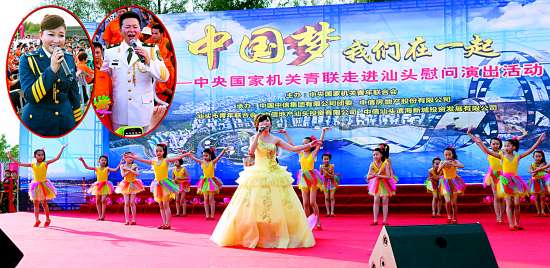 昨天下午,还在项目工地现场举办了“中国梦·我们在一起”——中央国家机关青联走进汕头慰问演出活动,中央国家机关青联委员、总政歌舞团著名男高音歌唱家王宏伟,中央国家机关青联委员、空军政治部文工团女高音歌唱家王莉、北京京剧院青年京剧演员王奕戈、中国歌剧舞剧院青年女高音歌唱家高音,文化部青联主席、中国歌剧舞剧院男高音歌唱家高保利与汕头市青联委员及农民工联袂出演了一台饱含深情的精彩节目。在演出现场,出席活动的部分领导为来自各地的农民工子女代表赠送了书包、文具、书籍和玩具等爱心礼品。