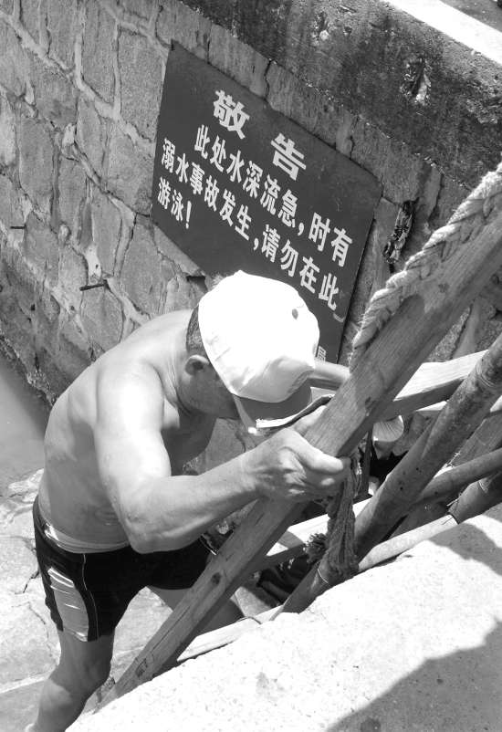 在海滨路造船厂吊桥下,尽管海面上散布不少水浮莲,但依然有人顺着架设吊桥旁的木梯下海。水上派出所所长马武彬介绍,他们巡逻时经常将这些“野泳者”私自架设的木(竹)梯撤掉没收,但没两天“野泳者”又再搭建新的“亲水通道”,依然下水“涉险”。