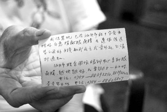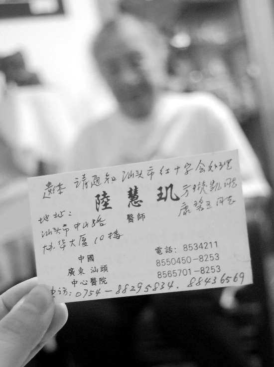 “我已在汕头市红十字会办理好自愿捐献眼角膜及遗体供医学之用的手续,如我死亡或意外死亡,请即通知汕头国际眼科中心来取眼角膜,越快越好……”这是一张陆慧玑自制的眼角膜及遗体捐献卡,如今无论去哪,她都随身携带。卡片原是她的名片,在正、反面上,老人家用笔书写了自己的心愿。“2002年的时候,我去登记了眼角膜捐献,人去世后,最好在5到6个小时内取出眼角膜去移植给有需要的人,超过时限就没用了。”陆慧玑坦言,她担心自己独居,万一去世没人知道,耽误捐献眼角膜的时限,所以自愿捐献眼角膜和遗体的卡片就一直揣在身上。