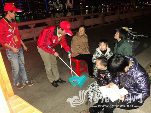 志愿者们自带清洁工具,清扫沿江绿化带的垃圾,以实际行动为“创文”加分。