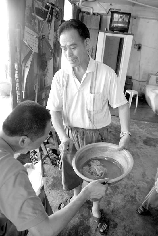 雕花的木制理发椅上随着顾客的挪动而发出“伊哎”声响,操着客家话的理发师傅用剃刀“刷刷”为客人修鬓刮胡,20多分钟后,客人就“旧颜换新貌”容光焕发起来。这家位于潮阳区西胪镇西一村综合市场附近的“老理发店”就这样日复一日运作着,要不是店中那两只老掉牙的理发椅引人关注,谁也不知道这家临街的简陋老店已走过了半个多世纪的历程,也曾有过顾客排队等候理发的风光历史……