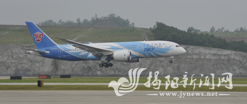 6月4日8时35分,南航接收的中国首架波音787“梦想客机”飞抵揭阳潮汕机场,开始为期2天的验证飞行。揭阳潮汕机场因具备良好的净空条件及硬件设施,本次被南航选为首架波音787飞机实施验证飞行的机场。蔡 中 摄