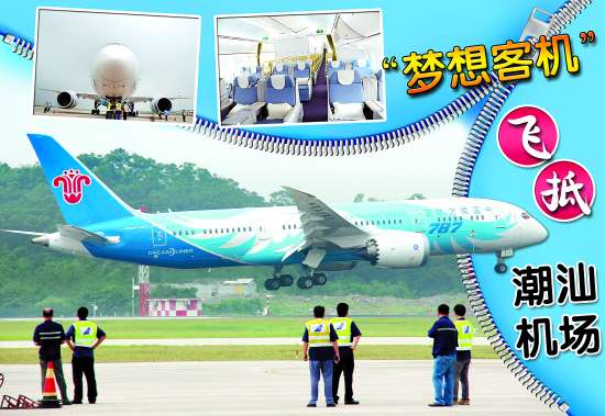 6月2日抵达广州加盟中国南方航空公司的中国首架波音787“梦想客机”,昨天转飞潮汕机场,开展为期两天的训练飞行,这是潮汕机场首次起降世界上最先进客机,也是潮汕机场投入使用以来降落的最大型民航客机。