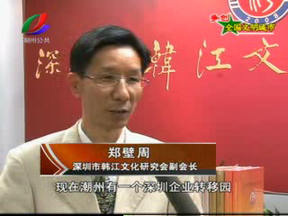 【同期声】深圳市韩江文化研究会副会长 郑壁周:现在潮州有一个深圳企业转移园,深圳的企业家非常关心也非常非常关注,大家都跃跃欲试,非常想投资家乡,我相信家乡的政府肯定会提供好的环境。
