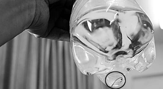 吴伯告诉记者,当时他发现盛出来的自来水里有异物,定睛一看后把他吓了一跳,原来水里竟游动着一条虫子!这条虫子细细长长,大约有10厘米,呈黄褐色。被吓坏了的吴伯停止做饭,找来了一个可乐瓶将虫子装起来(见图)。