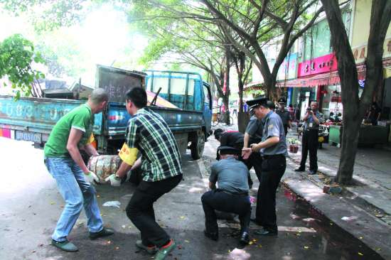 记者采访中发现,无论是茶店、饭店、药店、文具店或房产公司,随意占据机动车道、人行步道、停车泊位的现象比比皆是,用来占道的路障物更是五花八门,有石墩、雪糕筒或椅子,甚至连绿化植物和垃圾桶都派上用场。每个水泥浇注而成的实心石墩轻则数十斤,重的至少有一百来斤,四五名执法人员一齐出力才能把它抬上执法车辆。