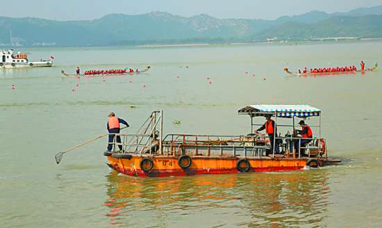昨天,二艘清污船正在第二届汕头海湾龙舟赛赛道海面打捞水浮莲等水面垃圾。为了确保赛场环境卫生,赛事组委会还将在赛道外围建立拦截带,阻挡水上垃圾漂入赛场。