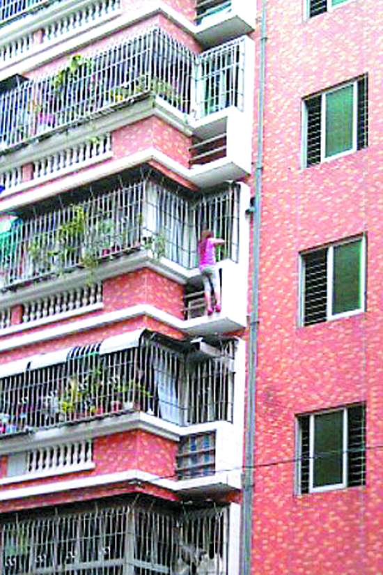 本报讯(记者 杨立轩 摄影报道) “救命!救命!”昨天下午3时多,在万安花园住宅小区乘凉的蔡女士突然听到12栋楼上传来呼救声,她抬头一望,只见一名神色慌张的女子站在4楼窗外的空调机位,险象环生。幸好,消防官兵随后到场成功救下该女子。据附近住户介绍,该女子是从7楼沿着外墙往下爬,之所以这样做疑因遭受家庭暴力。