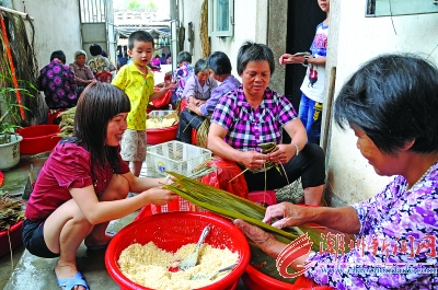 又到粽子飘香时。随着端午节临近,粽子迎来销售高峰。昨天上午,在潮安县凤凰镇一栀粽加工作坊几十名妇女正在忙于包栀粽。据了解,连日来在这里每天有10000多条栀粽销往广州、汕头、潮州、饶平等地。 本报记者陈宏文 陈培娜摄