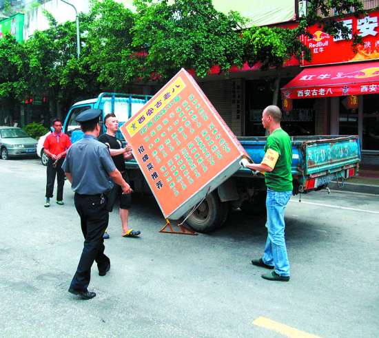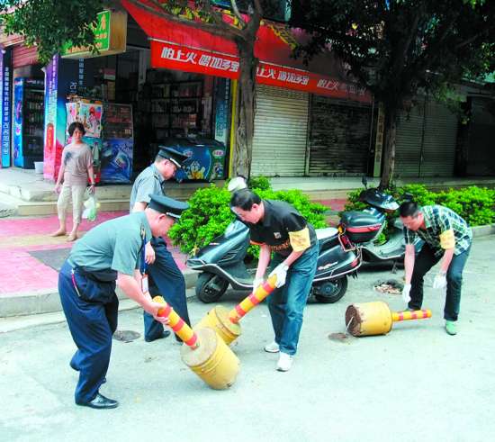 本报讯 记者李伟烽摄影报道:花盆、灯箱、水泥柱、大石头、自行车……一些临街的店铺商家为自身经营利益、怕“影响生意”,经常设置各种障碍物非法侵占城市道路和停车泊位,给市民日常出行、停车带来了不少困扰,是市民投诉的热点问题。近日,市城管执法部门联合环卫等部门组成执法队伍,前往市区广厦街、长平路等路段,清理整治占用道路设置障碍物、影响市容环境的违法违章行为。