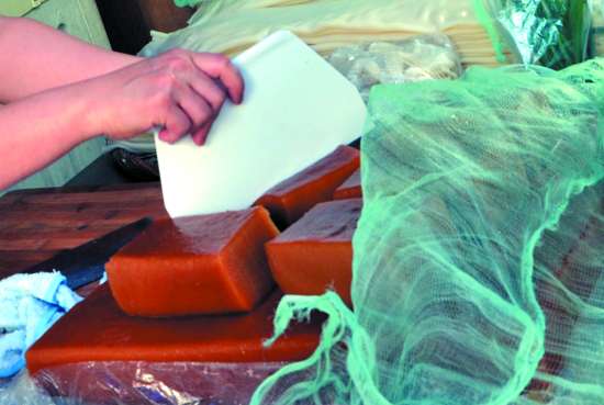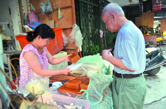 昨天凌晨3点,在衡山菜市场附近经营@条面店的杨兄夫妻俩摸黑起床,准备做栀@。他们先是将经过浸泡的15斤糯米磨成米浆,再加入1斤食用碱,同时调制一碗黄栀水,为了着色,水中还加入了陈年水仙茶,然后边倒入米浆中,边将其拌匀。接着,在一个方形的深铁盘上刷上油,垫上布,浇上搅拌均匀的米浆,放入炉火上蒸。三个小时后,天色渐亮,栀@也新鲜出炉了。打开锅盖,一阵甘香扑面而来,这一盘栀@将近40多斤。一般须放置1个多小时,栀@放凉凝固后,@身颜色从刚出炉的略微发白,慢慢变得深沉发亮,呈偏棕的茶色,才能开始售卖。早上7点许,杨兄经营的小店开始营业,立马就有老熟客前来购买。半个小时不到,他们就卖了将近10斤栀@。