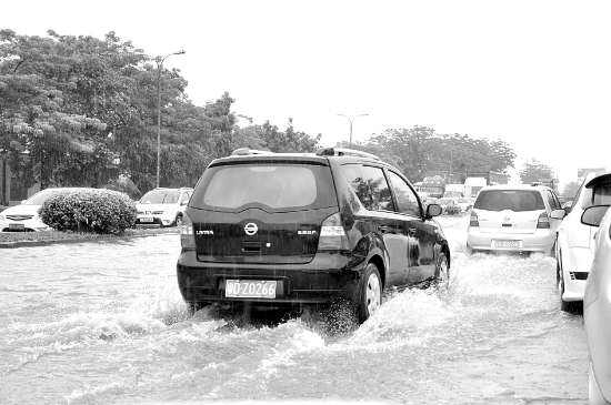 本报讯 (记者蔡晓丹)昨天持续降雨,大学路多处路段出现严重积水。乍一看,大学路俨然成为一条“大学河”,过往车辆和行人只能在水中通行。