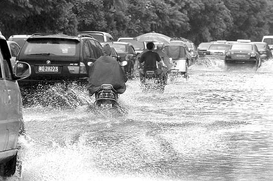 由于积水过深,有些车辆经过时溅起的水花足有两米多高,从旁经过的行人和摩托车主几成“落汤鸡”。大部分摩托车主为了避开积水较深的地方,左穿右串,道路通行险象环生。
