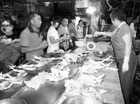 昨天下午4时多,记者来到市区金砂东路附近的农贸市场发现,这里不少摊档前均围着三五成群的顾客。尤其是一些经营活禽的档口,更是呈现出一派购销两旺的景象(见下图)。“我们摆卖的鸡鸭等家禽,最近两天来销售明显‘升温’。”现场部分“三鸟”摊档经营者告诉记者,特别是昨天适逢端午节,前来选购“光鸡”及鸡腿的顾客更是络绎不绝,高峰期他们往往忙得不可开交,活禽交易一扫前段时间生意冷清的局面。