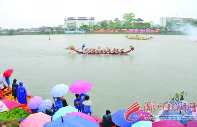 昨天是端午节。当天下午,饶平县城黄冈河畔彩旗飞扬、鼓乐喧天,一年一度的龙舟比赛在这里举行。天空虽然下着大雨,却没有减弱群众观看龙舟比赛的热情。