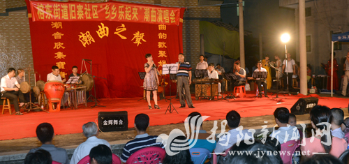 前天晚上,由榕城区榕东街道文化站主办的“乡乡乐起来”潮曲演唱晚会在旧寨社区举行,潮曲爱好者及专业演员为群众献上《柴房对唱》、《爱歌》等潮曲节目,精彩的演出赢得观众的阵阵掌声。图为潮曲演唱晚会现场。涂英鹏 陈南霞 摄