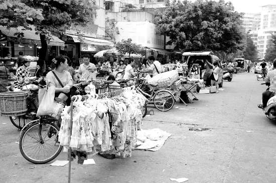 在附近开店的一位大姐告诉记者,一到周末这条街更热闹,卖筷子香囊的、卖皮鞋皮包的、卖衣服鞋袜的,应有尽有。附近小区的保安员林叔也表示,这条街的占路为市问题由来已久,但自从红荔综合市场开张,聚拢而来的小贩似乎有增无减。“几乎每天城管人员都会来赶,有时甚至一天来好几趟。”林叔称,但是效果不明显,往往是城管来了小贩一哄而散,城管一走又重新开张。