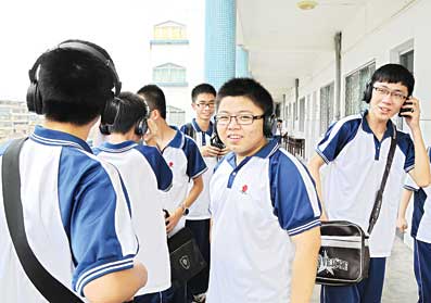 今天,我市迎来了一年一度的中考。据市招生办消息,今年我市共有38692名考生参加中考,全市共设考场40个。图为昨天下午,在市区城南中学考场,考生们正在各自的试室外调试无线耳机,以确保届时英语听力考试顺利进行。本报记者陈宏文 摄