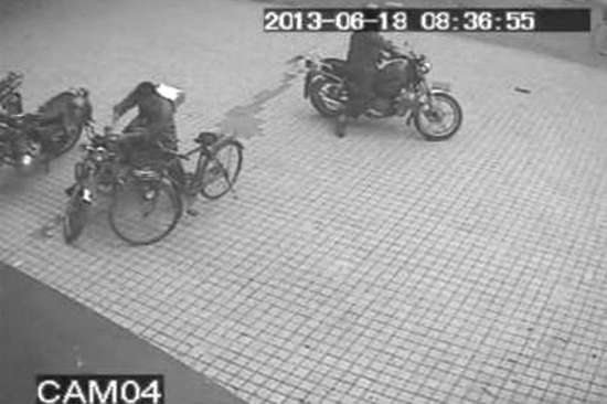 尽管当时营业厅门口人来人往,但盗车的窃贼却一直若无其事,甚至还配戴上安全帽,并将摩托车迅速推离现场。根据闭路监控显示,这两名窃贼从出现到得手逃离现场,仅仅用时30秒。而此时,距离摩托车车主离开的那一刻也不足一分钟时间。 本报记者 摄影报道