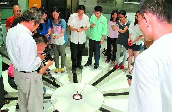 本报讯 记者黄鸿华摄影报道:今天是夏至,太阳直射北回归线。上午,记者来到汕头北回归线标志塔,看到一些市民自发前来目睹立竿无影奇景,中午12时15分左右,太阳直射汕头北回归线窥日圆孔,出现“立竿无影”现象。