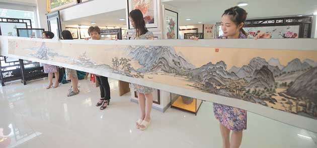 6月21日,潮州香聚绣庄的绣娘展示潮绣绣品《富春山居图》。由香聚绣庄制作的潮绣《富春山居图》以元代画家黄公望的原作整幅画卷为蓝本,长8.5米,宽4.5米,由6位绣工耗时约半年时间完成。作品运用绒线的深浅着色,以达到水墨画“墨分五色”的艺术效果。新华社发