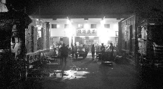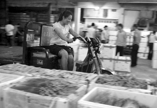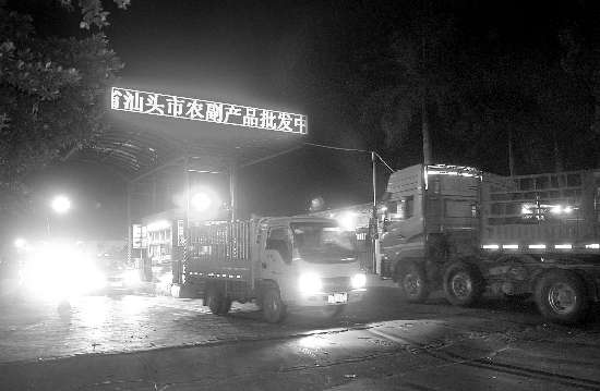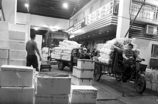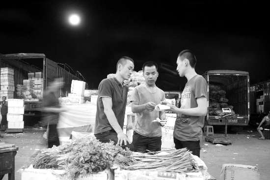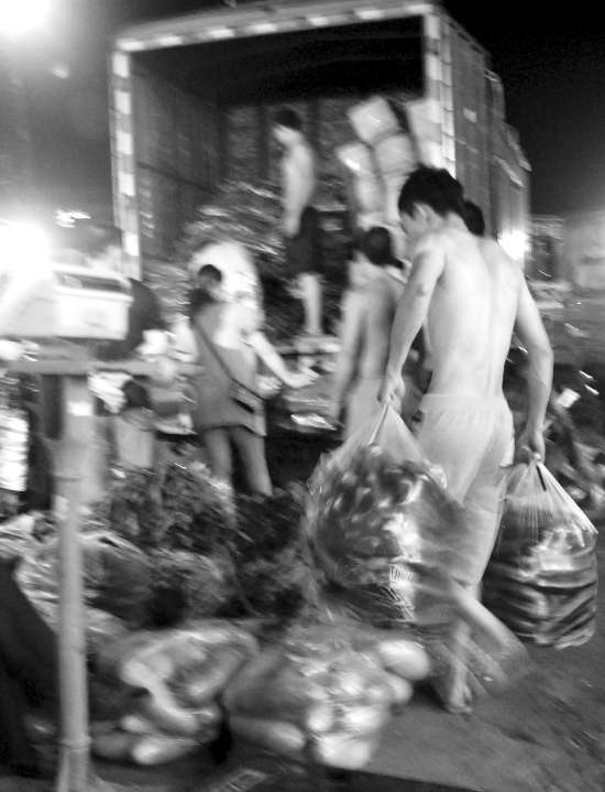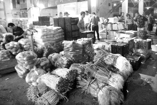 昨天晚上10时多,记者来到了位于泰山路的市农副产品批发中心市场,市场外面的路段除了过往车辆外,相对冷清,但进入场内,却是一片红火景观:里面灯火通明,汽车轰鸣声、人声不绝于耳。各个经营档口前面的空地上,停满了来自河北、山东、浙江、福建等地的大小货车,上面都装满了一袋袋或是一件件的蔬菜,像红白萝卜、苦瓜、芥兰、红辣椒、土豆、包菜等等,让人眼花缭乱。买卖双方商讨着售价,而驾驶着电瓶三轮车的搬运工们忙着将大货车上的蔬菜卸运到电瓶车上,上地磅计量过秤,再载运到顾客所指定的转运车辆上。