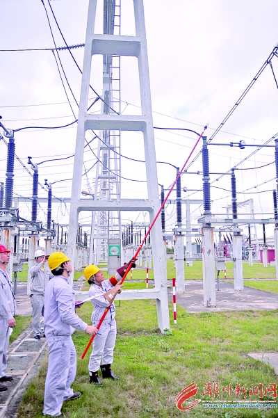 供电局与东莞等其他5城市举行综合应急演练,实战检测协同应对大面积停电的能力。图为工作人员在模拟摘除开关间的飘移物。