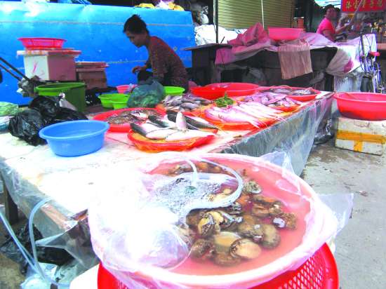 记者随后来到市区龙北、金砂东等处的农贸市场,同样看到“活鲍鱼便宜卖”的现象(右图)。其中,个头有三根手指大小的鲍鱼一只仅售4至5元左右。据介绍,这些较为大粒的鲍鱼,无论是肉质还是味道,也都会略胜一筹,因此选购者大有人在。不少摊贩也表示,这些个头较大的鲍鱼更为抢手。