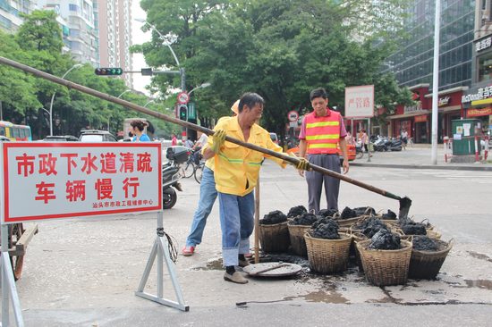 市政排水三所负责人彭振环介绍,在他们管辖路段中,金新路(金砂—中山)情况非常复杂,该路段地下埋设的并非圆形管径的排水管,而是石砌的“方沟”,建成多年地基沉降,大雨过后外部大量的泥沙通过缝隙冲进下水道中,成为阻塞排水畅通的淤塞物。在这段约700米的下水道中,清疏人员一天要“掏”出110至120筐、每筐重达80斤的黑色淤泥。市政人员担忧,随着时间推移,沙土流失过度或可能引起路面坍塌。