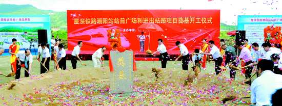本报讯 (记者林馥盛)昨天上午,厦深铁路潮阳站站前广场和进出站路项目举行奠基开工仪式,这标志我市“乡贤反哺”工作迈上一个新台阶,也是全市交通大会战一个重要的亮点。市委书记陈茂辉,市委常委、秘书长张应杰以及深圳市潮汕商会会长、潮商集团董事长吴开松,深圳市潮汕商会名誉会长、潮商集团董事局主席黄振达,深圳市潮汕商会名誉会长、加拿大潮汕商会会长林少毅等出席仪式,陈茂辉、吴开松、黄振达等为项目奠基石揭幕,并与其他出席仪式的领导和嘉宾共同为项目奠基石培土。