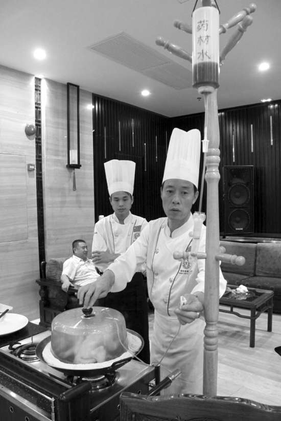 一口热气腾腾的锅竟然在“打吊针”?(右大图)其实,这是顺德名厨以独创的烹饪方法,将30多味中药材秘制而成的药水,通过吊针慢慢地流入蒸锅中,不足20分钟,一道原汁原味、爽嫩可口的“香薰鸡”香溢四周,让旁人垂涎三尺。顺德厨师一鼓作气,还带来了“炒牛奶”这道顺德传统名菜,经验丰富的汕头厨师也毫不示弱,献上独具潮汕风味的“返沙香芋”,绿色环保又健康,给外地游客带来不一样的味蕾体验。