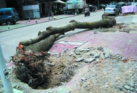 位于汕头金砂东路旁的丹霞路,原本栽种的红花紫荆树木繁盛,为附近居民遮阳挡雨。近日,有市民反映,一夜之间,这条区间道两旁的树木被连根锯断,一株株树木被切割只剩树干横陈路上(如图),平日高大挺拔的树木变成这般模样,居民们觉得十分可惜,他们认为,这些绿树很多树龄超过20年,十分难得,管理部门应当做好树木移植工作,不能简单一砍了事。